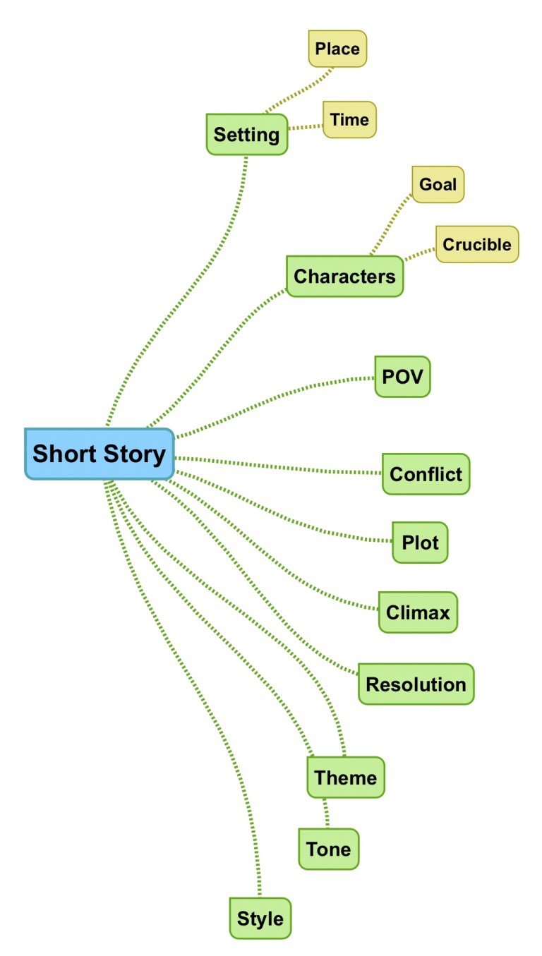 I’ve been using a mind map app called SimpleMind+ to collect elements of what makes a short story. I realize this could also be used as a template for developing a story: