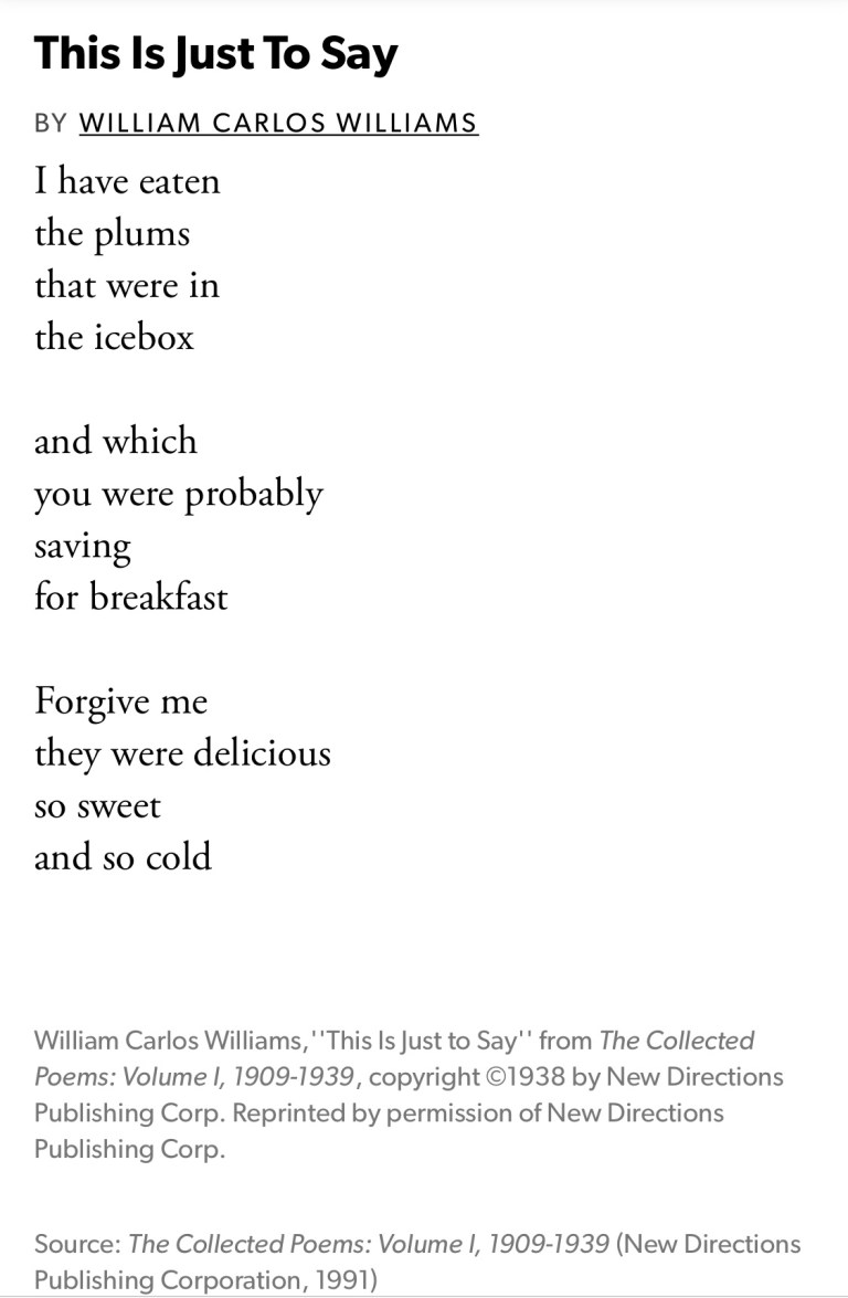 May 27, 2018May 27, 2018 “This is Just to Say” by William Carlos Williams Source: https://www.poetryfoundation.org/poems/56159/this-is-just-to-say Click to buy: Share this: Share on Facebook (Opens in new window) Facebook Share on X (Opens in new window) X Like Loading... Related
